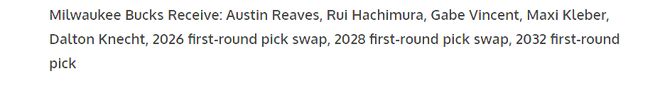 密尔沃基雄鹿:获得里夫斯、八村塁、文森特、马克西・克莱伯、克内克特,3个首轮签互换权、2032年首轮选秀权。