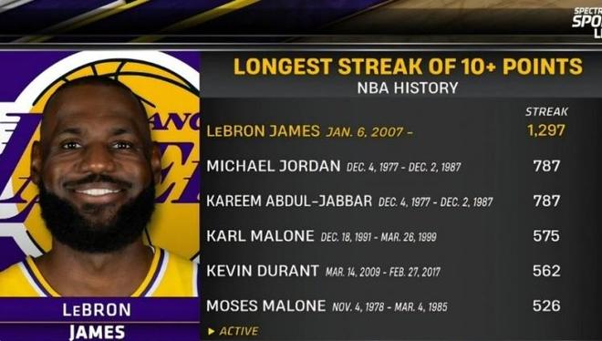 詹姆斯连续1297场上双纪录终结