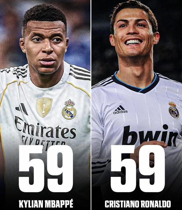 至此,姆巴佩以2025年61场59球,追平了C罗在2013年创下的50场59球皇马队史年度俱乐部进球数的纪录!